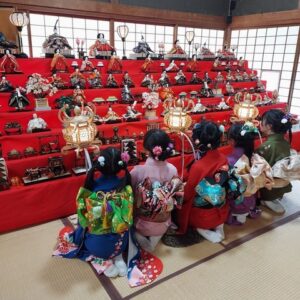 県内一を誇る幅8mひな壇に昭和中期7段飾り7セットのお雛様が飾られ明治・大正時代、