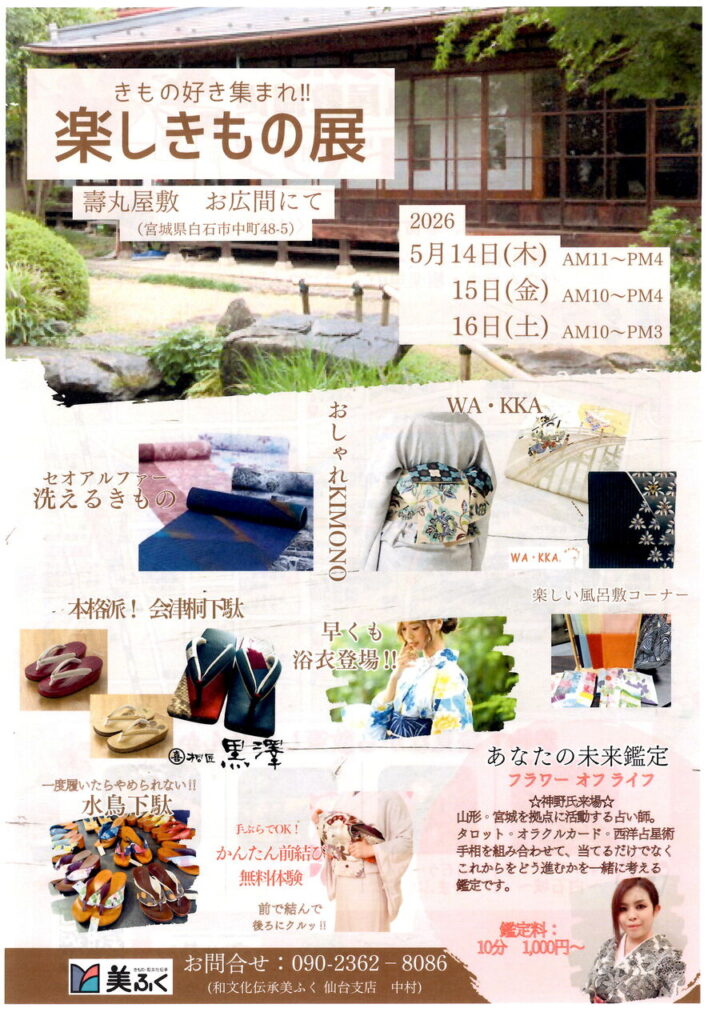 寿丸屋敷 『きもの好き集まれ!楽しききもの展』 wawa@fancy.ocn.ne.jp 2026-04-09 1 分読み取り ◆きもの好き集まれ!楽しききもの展 日時: 5/14(木)11時~16時 5/15(金)10時~16時 5/16(土)10時~15時 場所:壽丸屋敷大広間 連絡:中村 090-2362-8086 投稿ナビゲーション 前: ◆第19回しろいしマルシェ コメントを残す コメントをキャンセルメールアドレスが公開されることはありません。 ※ が付いている欄は必須項目ですコメント ※ 名前 ※ メール ※ サイト 次回のコメントで使用するためブラウザーに自分の名前、メールアドレス、サイトを保存する。 関連記事 寿丸屋敷 ◆第19回しろいしマルシェ wawa@fancy.ocn.ne.jp 2026-04-05 寿丸屋敷 ◆きものでお花見~◆ wawa@fancy.ocn.ne.jp 2026-03-30 寿丸屋敷 チクチク・トントン春のおくりもの展 wawa@fancy.ocn.ne.jp 2026-03-27